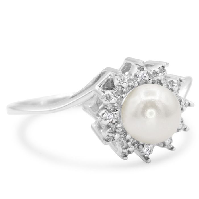This ring features one 6mm freshwater cultured pearl. It has four diamond accents in I-J color, I2-I3 clarity at 0.02 carats total. This ring is in 14 karat white gold.