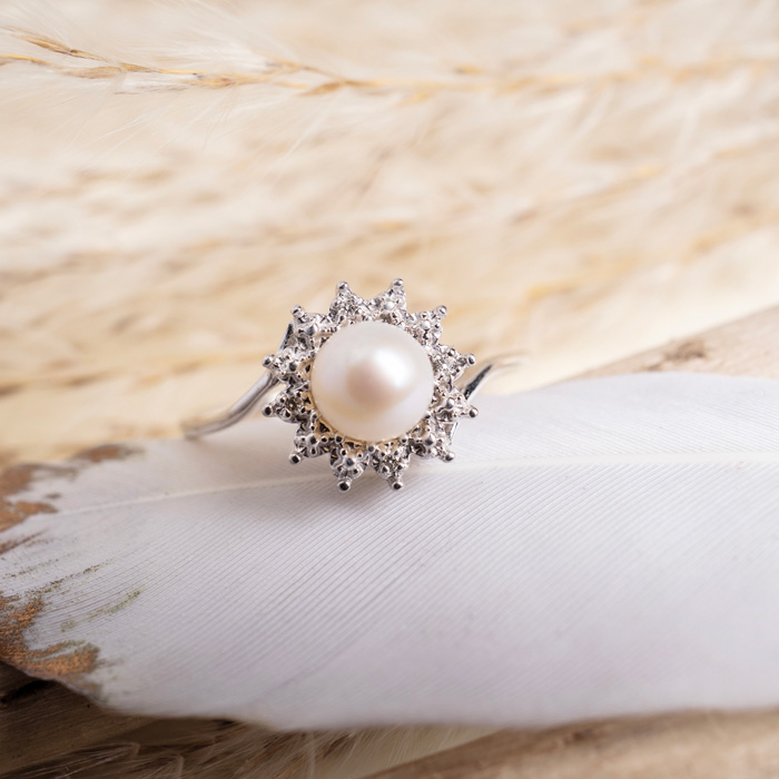 Round Freshwater Cultured Pearl and Halo Diamond Ring In 14 Karat White Gold