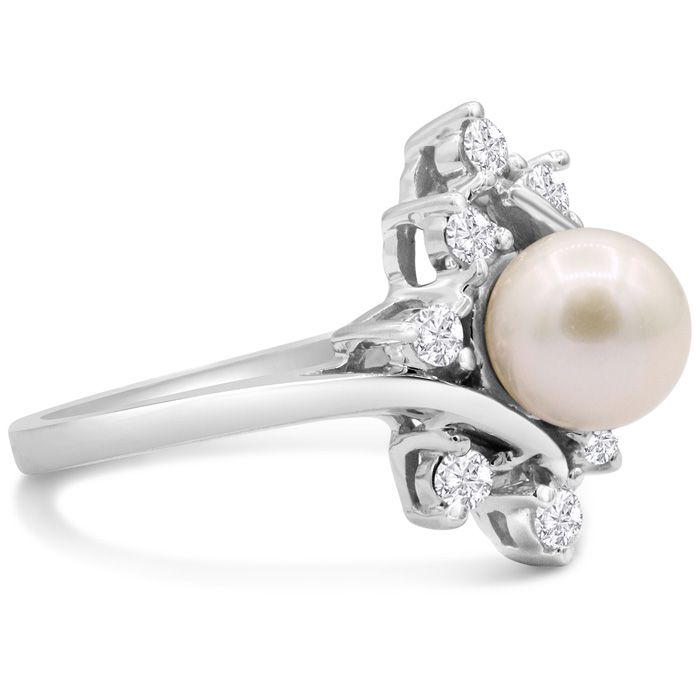 This ring features one 7mm freshwater cultured pearl. It has 8 diamond accents in a halo in I-J color, I2-I3 clarity at 0.16 carats total. This ring is in 14 karat white gold.