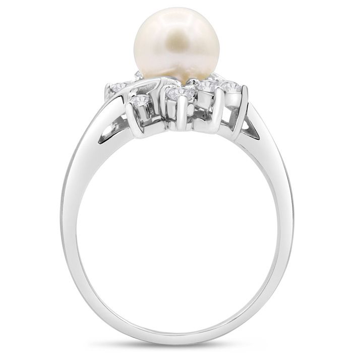 Round Freshwater Cultured Pearl and Halo Diamond Ring In 14 Karat White Gold