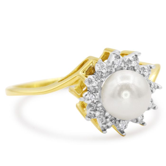 This ring features one 6mm freshwater cultured pearl. It has four diamond accents in I-J color, I2-I3 clarity at 0.02 carats total. This ring is in 14 karat yellow gold.