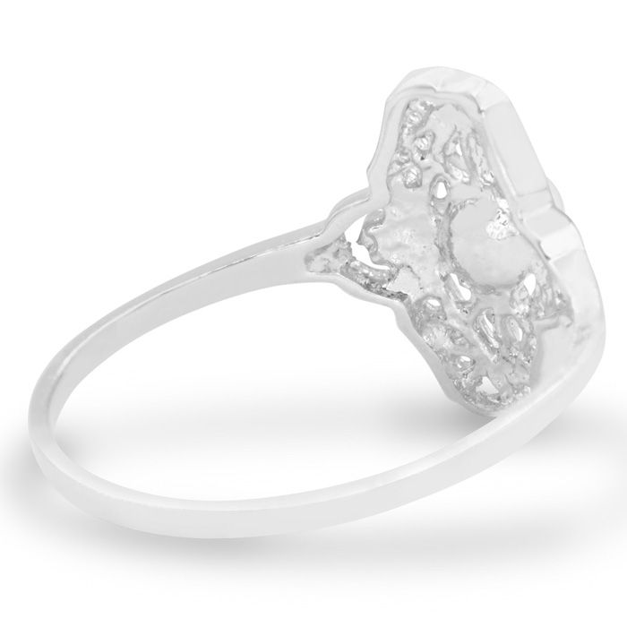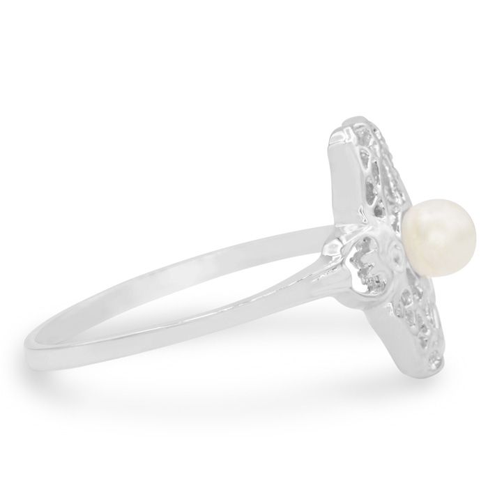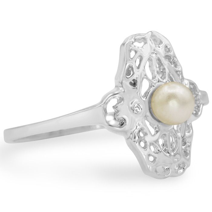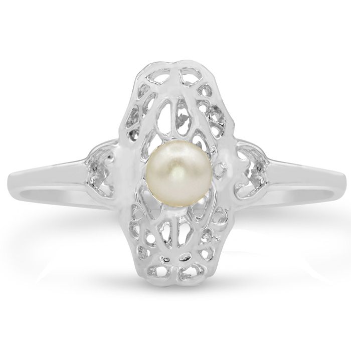 This ring features one 4mm freshwater cultured pearl. It is in a vintage setting. This ring is in 14 karat white gold.
