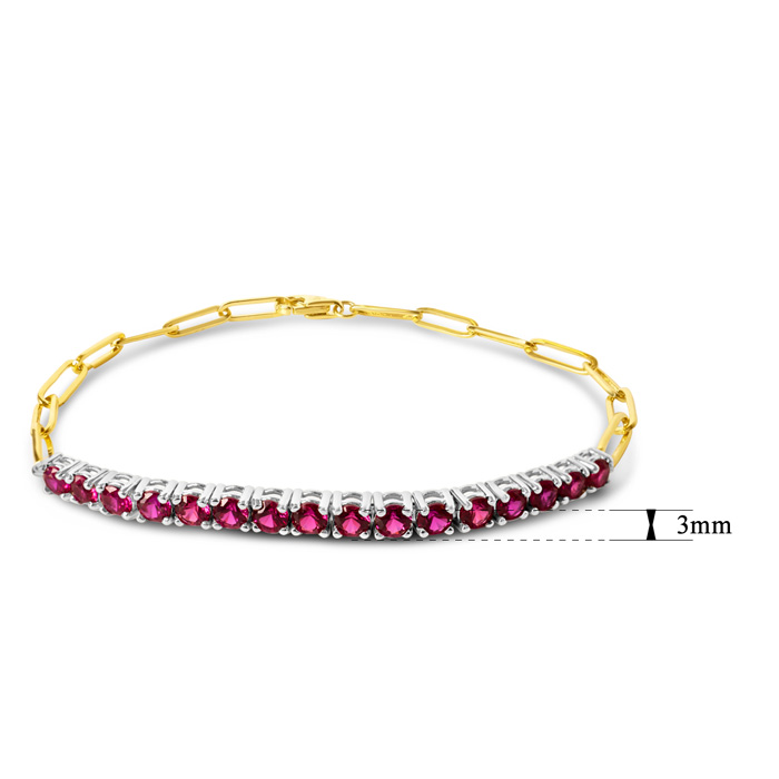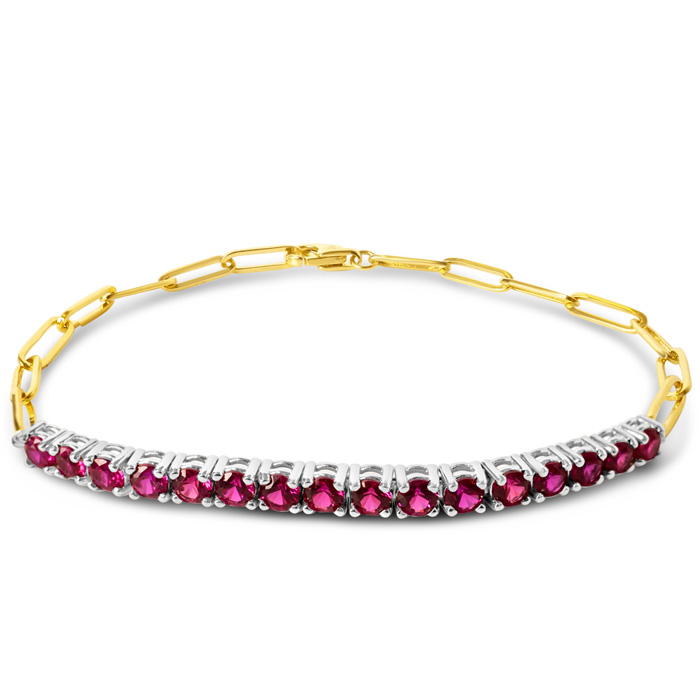 This ruby bracelet features 16 sparkling created ruby gemstones. Total carat weight is 1 1/2 carats. This paperclip bracelet in 14 karat yellow gold. This bracelet fits a 7 inch wrist and has a secure, lobster-claw clasp.