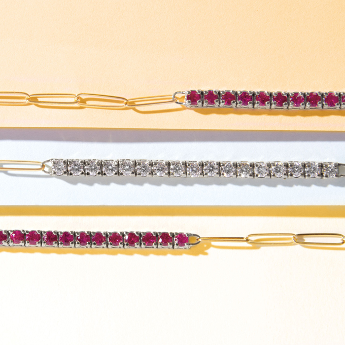 1 1/2 Carat Ruby Tennis Bracelet On 14 Karat Yellow Gold Paperclip Chain, 7 Inches