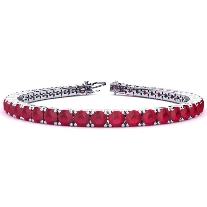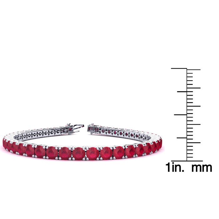 This classic ruby bracelet features shimmering ruby gemstones. The 6 inch bracelet contains 39 gemstones at 10.53 carats. The 6.5 inch bracelet contains 42 gemstones at 11.61 carats. The 7 inch bracelet contains 45 gemstones at 12.42 carats. The 7.5 inch bracelet contains 49 gemstones at 13.23 carats. The 8 inch bracelet contains 53 gemstones at 14.31 carats. The 8.5 inch bracelet contains 56 gemstones at 15.12 carats. The 9 inch bracelet contains 59 gemstones at 15.93 carats. This bracelet is approximately 3.8mm wide and is crafted in 14 karat white gold. This bracelet has a secure, box with tongue and safety clasp.