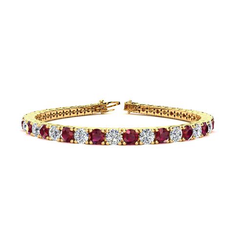 This classic ruby bracelet features shimmering white diamonds in I-J color, I1-I2 clarity and ruby gemstones. The 6 inch bracelet contains 39 gemstones and diamonds at 9.13 carats. The 6.5 inch bracelet contains 42 gemstones and diamonds at 10.07 carats. The 7 inch bracelet contains 45 gemstones and diamonds at 10.81 carats. The 7.5 inch bracelet contains 49 gemstones and diamonds at 11.48 carats. The 8 inch bracelet contains 53 gemstones and diamonds at 12.42 carats. The 8.5 inch bracelet contains 56 gemstones and diamonds at 13.16 carats. The 9 inch bracelet contains 59 gemstones and diamonds at 13.83 carats. This bracelet is approximately 3.8mm wide and is crafted in 14 karat yellow gold. This bracelet has a secure, box with tongue and safety clasp.