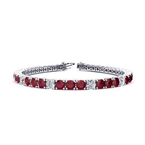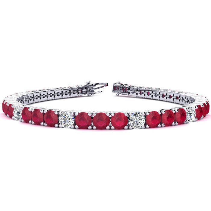 This classic ruby bracelet features shimmering white diamonds in I-J color, I1-I2 clarity and ruby gemstones. The 6 inch bracelet contains 39 gemstones and diamonds at 9.90 carats. The 6.5 inch bracelet contains 42 gemstones and diamonds at 10.91 carats. The 7 inch bracelet contains 45 gemstones and diamonds at 11.65 carats. The 7.5 inch bracelet contains 49 gemstones and diamonds at 12.39 carats. The 8 inch bracelet contains 53 gemstones and diamonds at 13.40 carats. The 8.5 inch bracelet contains 56 gemstones and diamonds at 14.14 carats. The 9 inch bracelet contains 59 gemstones and diamonds at 14.95 carats. This bracelet is approximately 3.8mm wide and is crafted in 14 karat white gold. This bracelet has a secure, box with tongue and safety clasp.