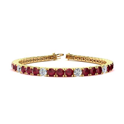 This classic ruby bracelet features shimmering white diamonds in I-J color, I1-I2 clarity and ruby gemstones. The 6 inch bracelet contains 39 gemstones and diamonds at 9.90 carats. The 6.5 inch bracelet contains 42 gemstones and diamonds at 10.91 carats. The 7 inch bracelet contains 45 gemstones and diamonds at 11.65 carats. The 7.5 inch bracelet contains 49 gemstones and diamonds at 12.39 carats. The 8 inch bracelet contains 53 gemstones and diamonds at 13.40 carats. The 8.5 inch bracelet contains 56 gemstones and diamonds at 14.14 carats. The 9 inch bracelet contains 59 gemstones and diamonds at 14.95 carats. This bracelet is approximately 3.8mm wide and is crafted in 14 karat yellow gold. This bracelet has a secure, box with tongue and safety clasp.