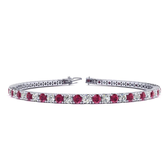 This classic ruby bracelet features shimmering white diamonds in J-K color, I1-I2 clarity and ruby gemstones. The 6 inch bracelet contains 57 gemstones and diamonds at 3.12 carats. The 6.5 inch bracelet contains 62 gemstones and diamonds at 3.41 carats. The 7 inch bracelet contains 67 gemstones and diamonds at 3.67 carats. The 7.5 inch bracelet contains 72 gemstones and diamonds at 3.96 carats. The 8 inch bracelet contains 76 gemstones and diamonds at 4.18 carats. The 8.5 inch bracelet contains 81 gemstones and diamonds at 4.44 carats. The 9 inch bracelet contains 86 gemstones and diamonds at 4.73 carats. This bracelet is approximately 2.25mm wide and is crafted in 14 karat white gold. This bracelet has a secure, box with tongue and safety clasp.