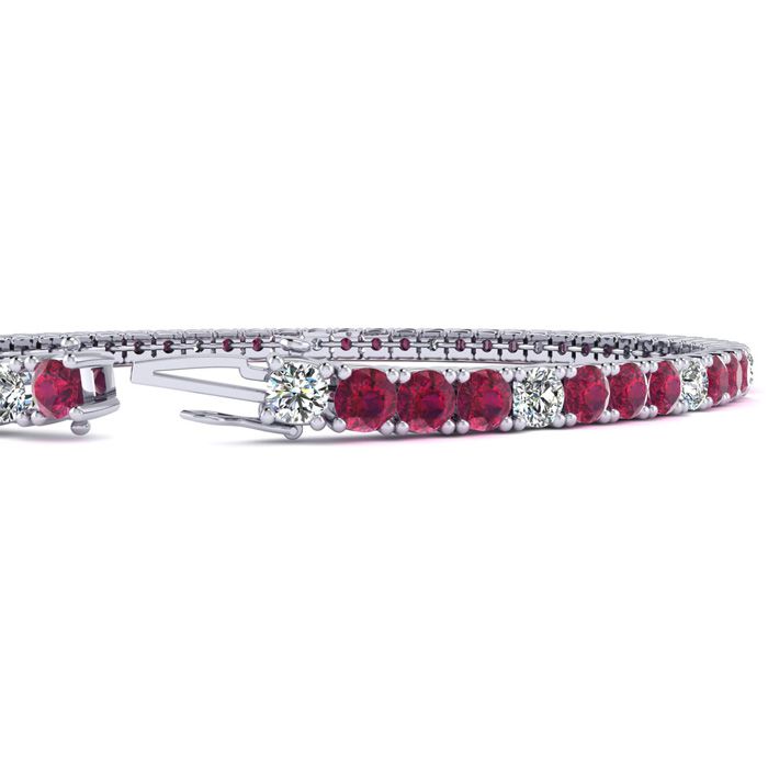 This classic ruby bracelet features shimmering white diamonds in J-K color, I1-I2 clarity and ruby gemstones. The 6 inch bracelet contains 57 gemstones and diamonds at 3.57 carats. The 6.5 inch bracelet contains 62 gemstones and diamonds at 3.89 carats. The 7 inch bracelet contains 67 gemstones and diamonds at 4.21 carats. The 7.5 inch bracelet contains 72 gemstones and diamonds at 4.50 carats. The 8 inch bracelet contains 76 gemstones and diamonds at 4.75 carats. The 8.5 inch bracelet contains 81 gemstones and diamonds at 5.07 carats. The 9 inch bracelet contains 86 gemstones and diamonds at 5.39 carats. This bracelet is approximately 2.25mm wide and is crafted in 14 karat white gold. This bracelet has a secure, box with tongue and safety clasp.