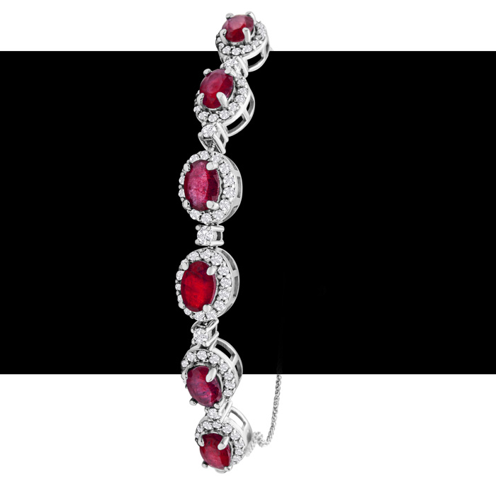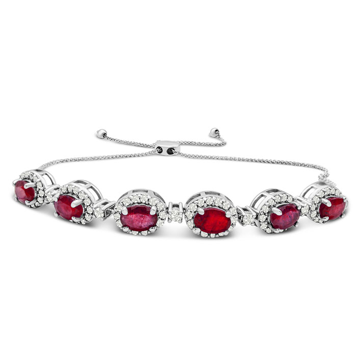 This stunning tennis bracelet features six 6x4mm oval shape ruby gemstones each weighing approximately 1/2 carat. It is surrounded by 101 sparkling diamonds in I-J color, I1-I2 clarity at 1 carat. Total carat weight is 4 carats. This bracelet is in 14 karat white gold and has an adjustable bolo clasp so you can wear it from 6-9 inches.
