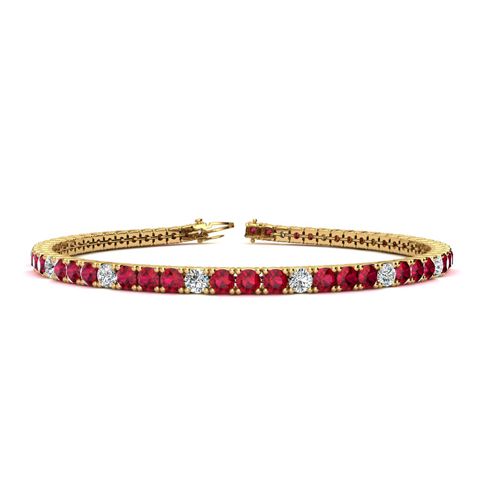 This classic ruby bracelet features shimmering white diamonds in J-K color, I1-I2 clarity and ruby gemstones. The 6 inch bracelet contains 57 gemstones and diamonds at 3.57 carats. The 6.5 inch bracelet contains 62 gemstones and diamonds at 3.89 carats. The 7 inch bracelet contains 67 gemstones and diamonds at 4.21 carats. The 7.5 inch bracelet contains 72 gemstones and diamonds at 4.50 carats. The 8 inch bracelet contains 76 gemstones and diamonds at 4.75 carats. The 8.5 inch bracelet contains 81 gemstones and diamonds at 5.07 carats. The 9 inch bracelet contains 86 gemstones and diamonds at 5.39 carats. This bracelet is approximately 2.25mm wide and is crafted in 14 karat yellow gold. This bracelet has a secure, box with tongue and safety clasp.