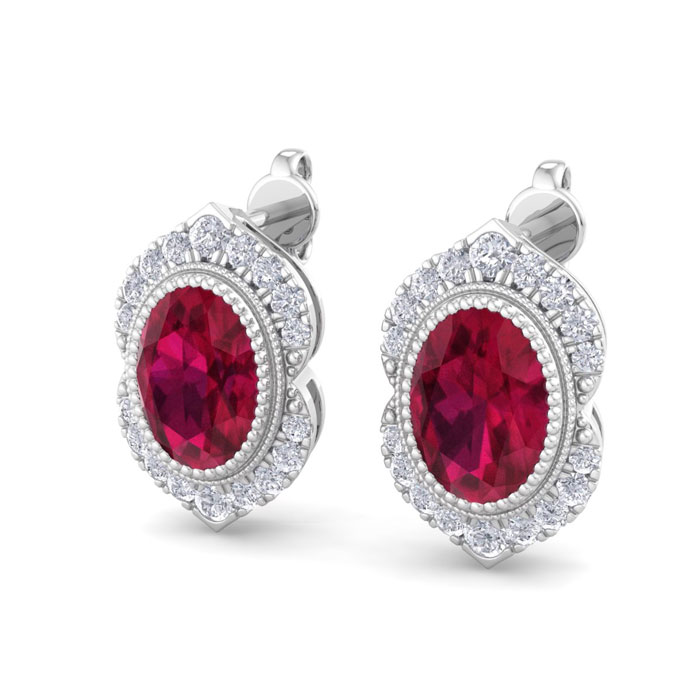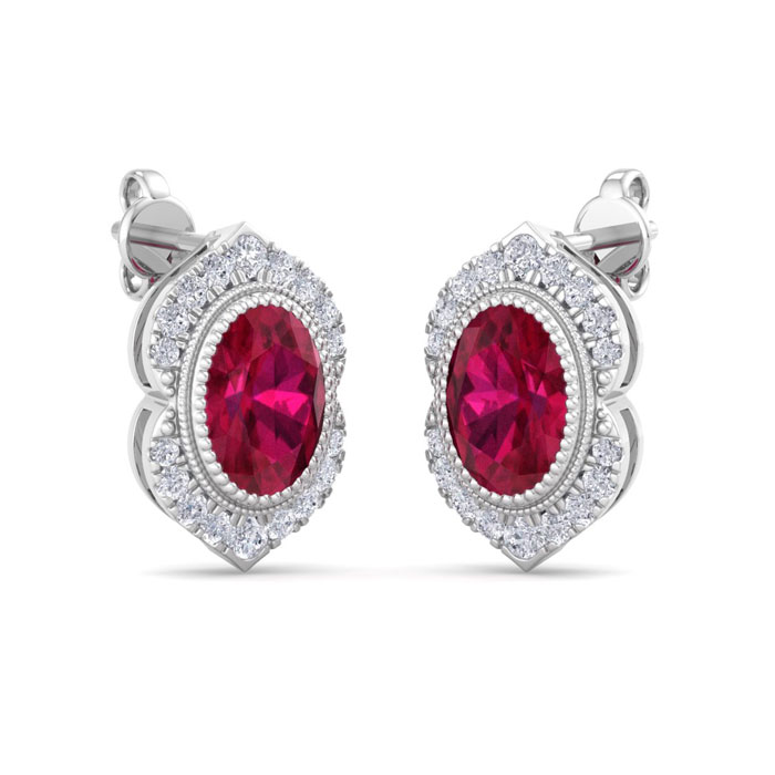 Retrograde Birthstones™ 2 1/2 Carat Oval Shape Ruby and Diamond Earrings In 14K White Gold
