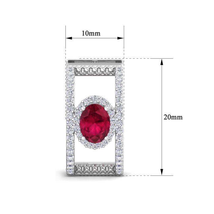 These ruby earrings feature two 7x5mm oval shape ruby gemstones totaling approximately 1 1/2 carats. They are accented with 106 lab grown diamonds weighing 1 carat. Total carat weight is 2 1/2 carats. Diamond color is G-H color, VS clarity. These earrings are in 14 karat white gold and dangle down 3/4 inch.