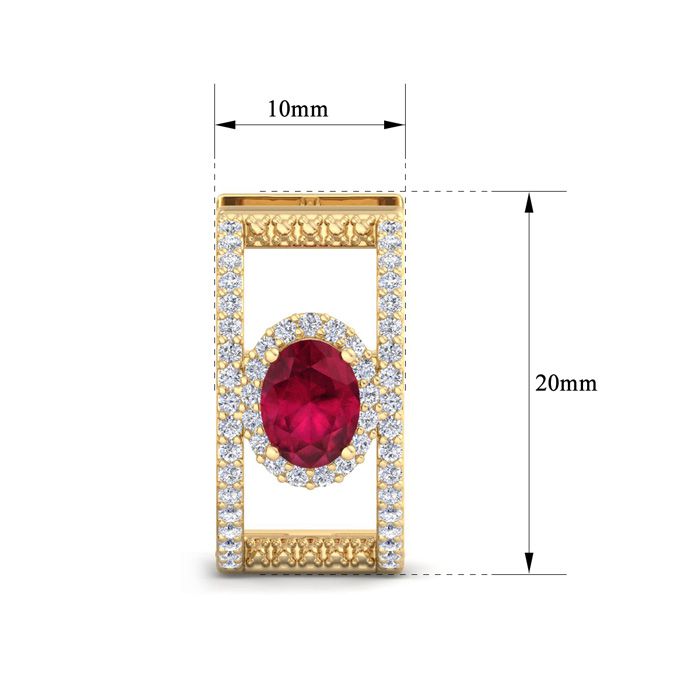 These ruby earrings feature two 7x5mm oval shape ruby gemstones totaling approximately 1 1/2 carats. They are accented with 106 lab grown diamonds weighing 1 carat. Total carat weight is 2 1/2 carats. Diamond color is G-H color, VS clarity. These earrings are in 14 karat yellow gold and dangle down 3/4 inch.