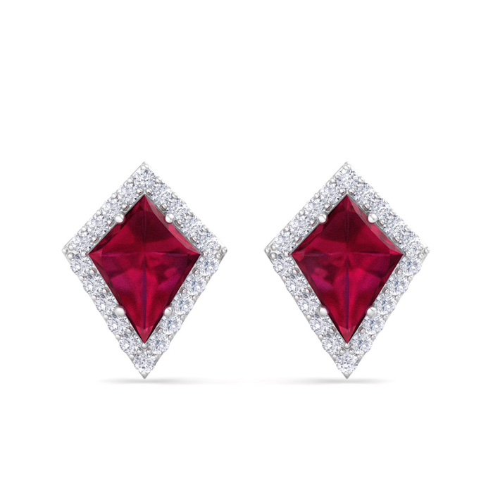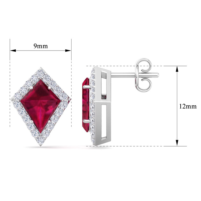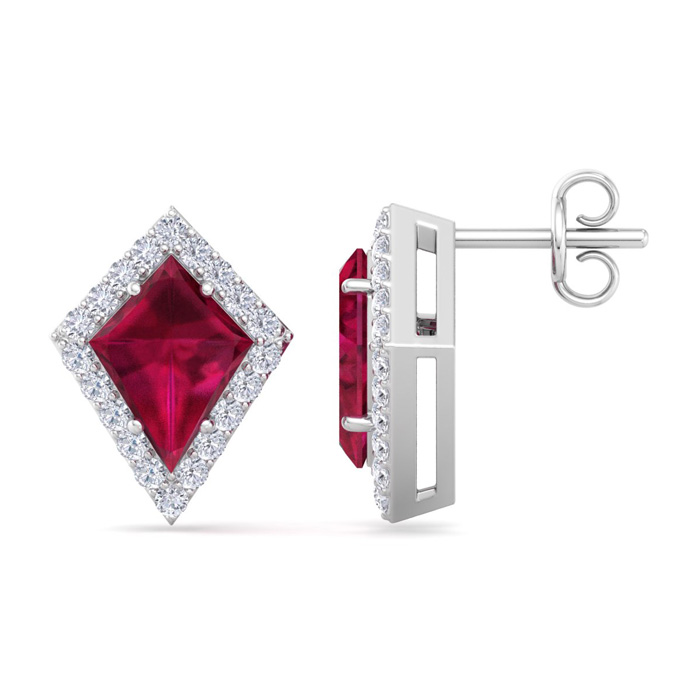 These gemstone earrings feature two 8x6mm kite shape created ruby gemstones each weighing approximately 1 carat. There are 40 sparkling diamonds in I-J color, I1-I2 clarity totaling approximately 1/5 carat. Total carat weight is 2 1/5 carats. These earrings are in 14 karat white gold.