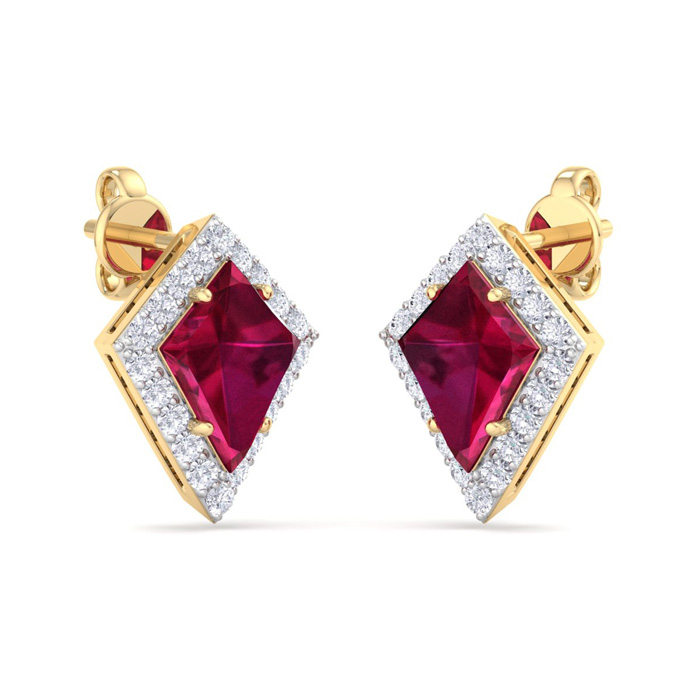 These gemstone earrings feature two 8x6mm kite shape created ruby gemstones each weighing approximately 1 carat. There are 40 sparkling diamonds in I-J color, I1-I2 clarity totaling approximately 1/5 carat. Total carat weight is 2 1/5 carats. These earrings are in 14 karat yellow gold.