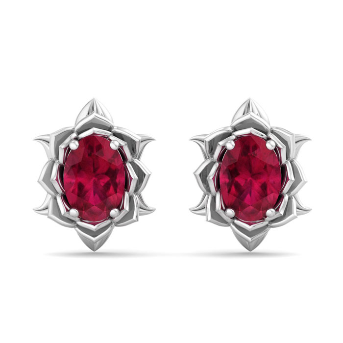 Retrograde Birthstones™ 2 Carat Oval Shape Ruby Ornate Stud Earrings In 14K White Gold