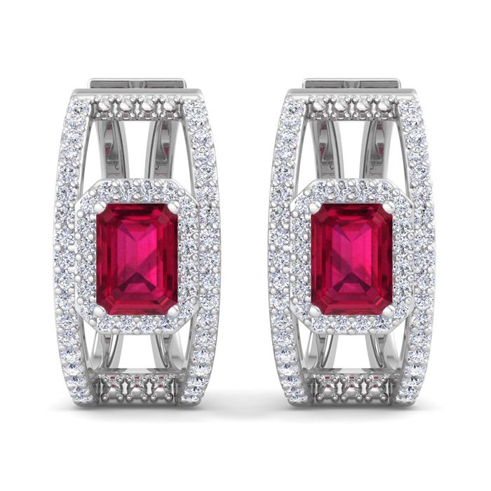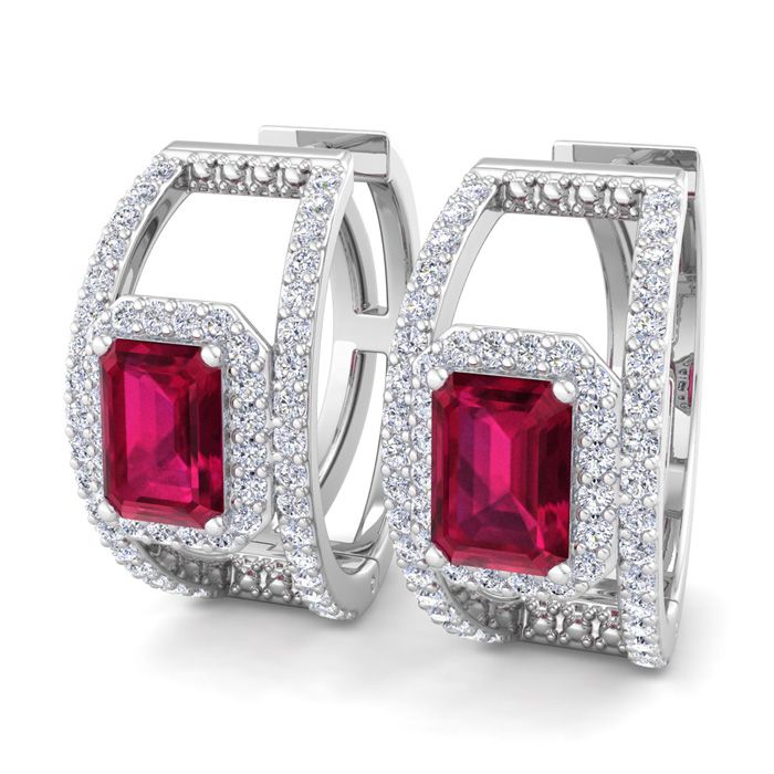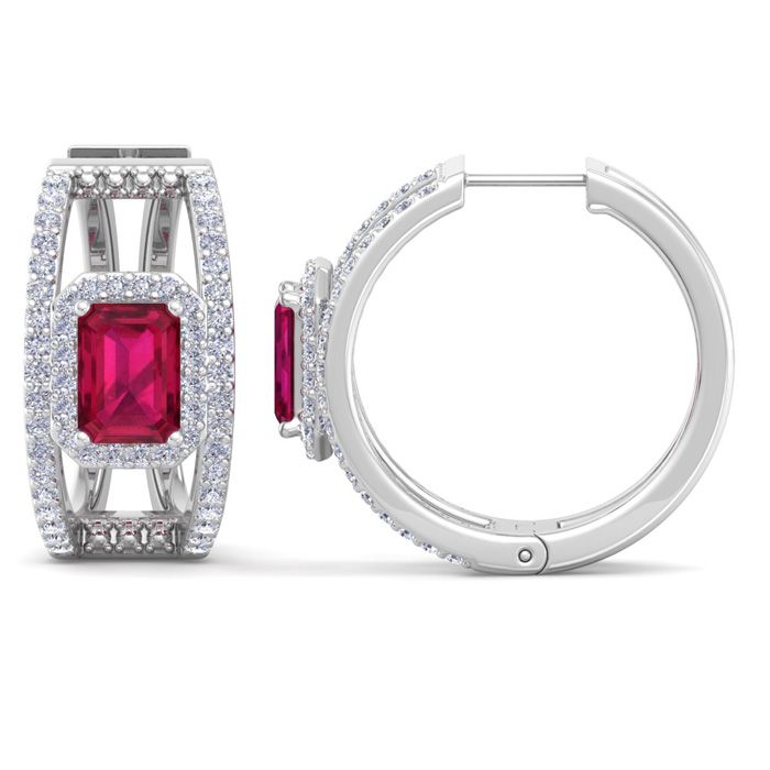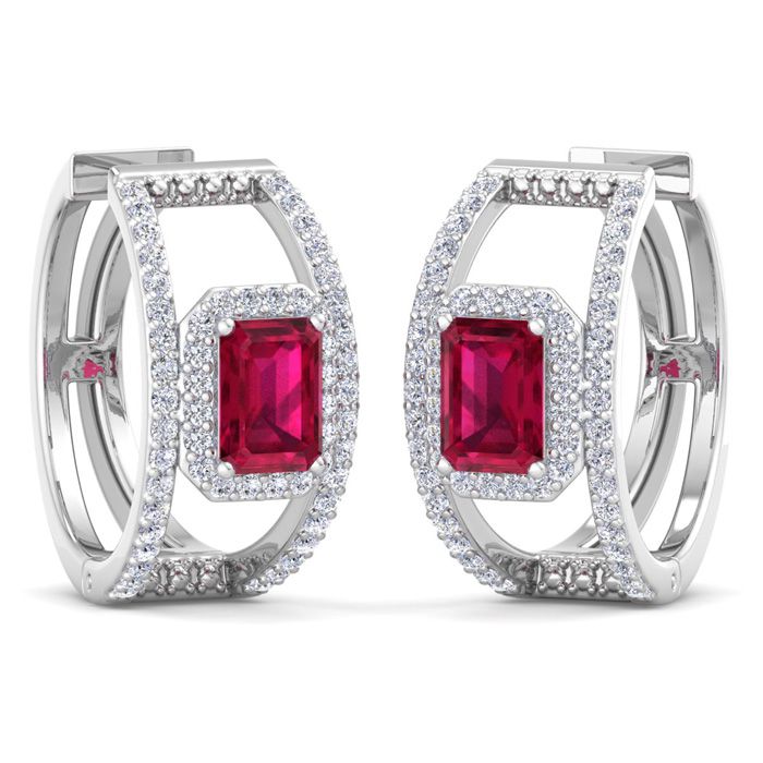 3 Carat Ruby and Lab Grown Diamond Hoop Earrings In 14 Karat White Gold