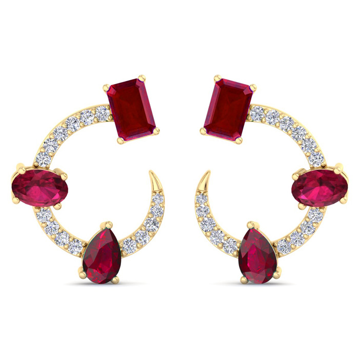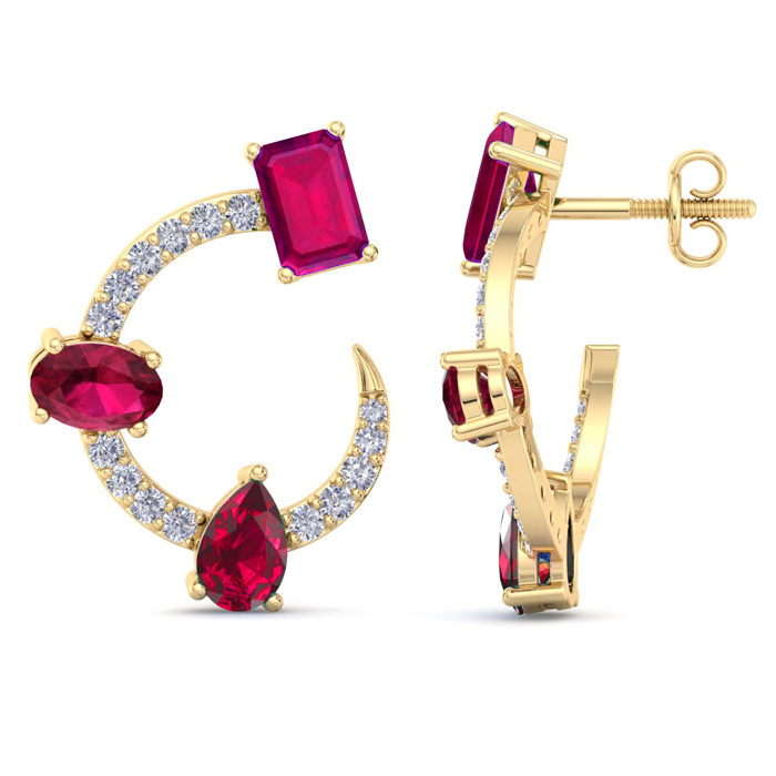 These lab grown diamond earrings feature 6 ruby gemstones and 30 round shape lab grown diamonds in G-H color, VS clarity. Total carat weight is 3 carats. These earrings are in 14 karat yellow gold. These earrings dangle down 3/4 Inch and have post with friction backs.