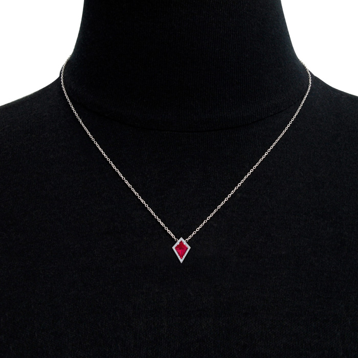This gemstone necklace features one 10x7mm kite shape created ruby gemstone weighing approximately 1 1/2 carats. There are 26 sparkling diamonds in I-J color, I1-I2 clarity totaling approximately 1/4 carat. Total carat weight is 1 3/4 carats. This necklace is in 14 karat white gold and comes with an 26 inch box chain with spring ring clasp.