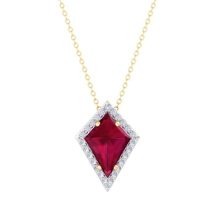 This gemstone necklace features one 10x7mm kite shape created ruby gemstone weighing approximately 1 1/2 carats. There are 26 sparkling diamonds in I-J color, I1-I2 clarity totaling approximately 1/4 carat. Total carat weight is 1 3/4 carats. This necklace is in 14 karat yellow gold and comes with an 26 inch box chain with spring ring clasp.