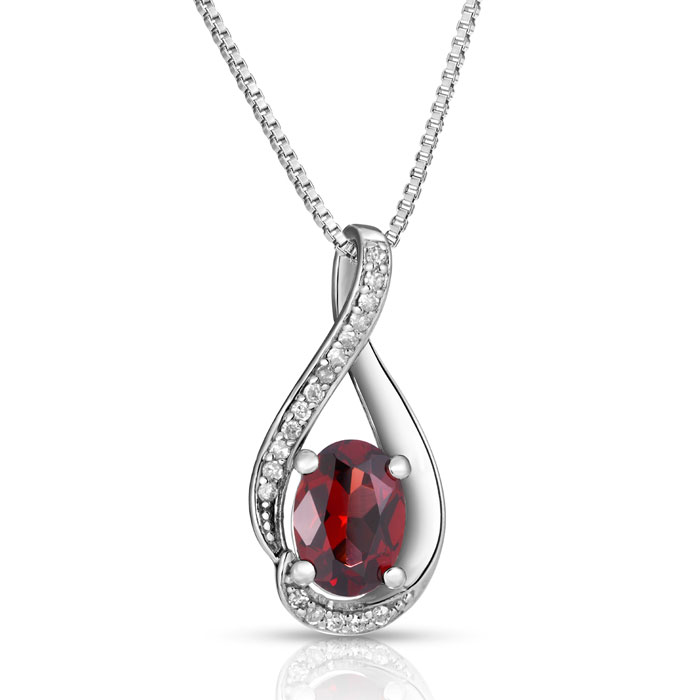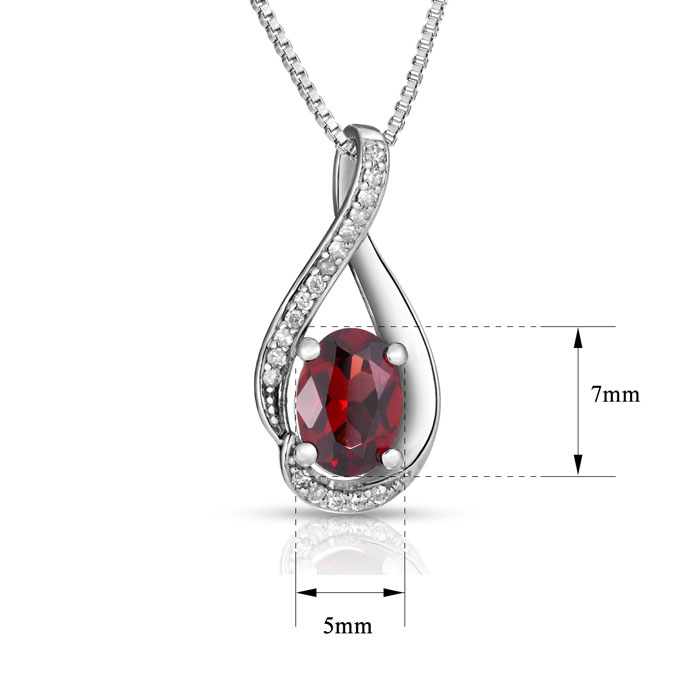 This stunning ruby necklace features one 6x4mm oval shape ruby gemstone weighing approximately 3/4 carat. It is surrounded by 18 sparkling diamonds in H-I color, I2-I3 clarity at 0.08 carats. This necklace is crafted in sterling silver and comes with an 18 inch box chain with spring ring clasp.