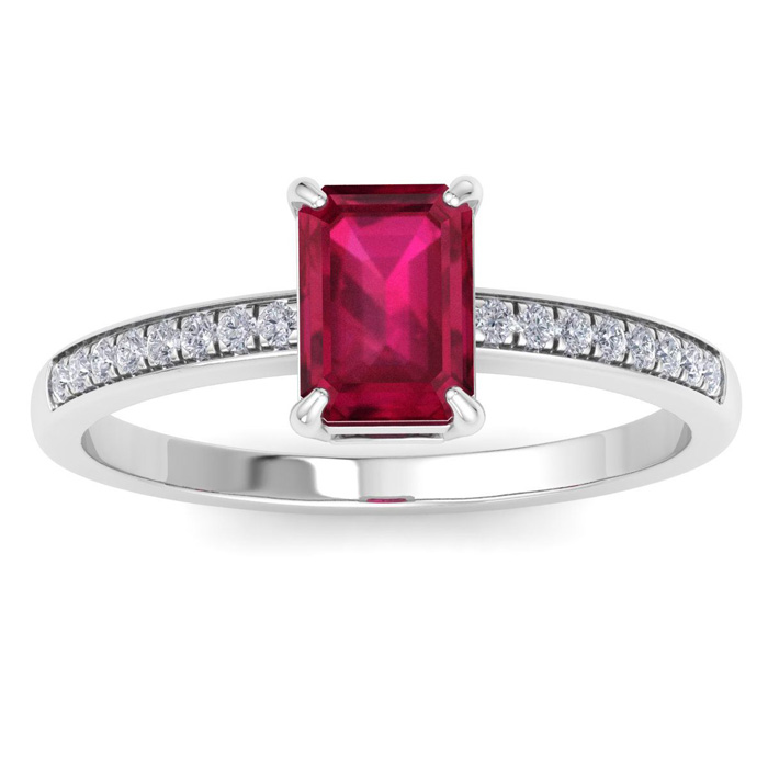 This gemstone ring features one 7x5mm emerald shape created ruby gemstone weighing approximately 1 carat. There are 16 sparkling round diamonds in I-J color, I1-I2 clarity totaling approximately 1/4 carat. Total carat weight is 1 carat. This ring is in 14 karat white gold.