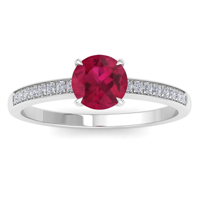 This gemstone ring features one 6.2mm round ruby gemstone weighing approximately 1 carat. There are 16 sparkling round diamonds in I-J color, I1-I2 clarity totaling approximately 1/4 carat. Total carat weight is 1 carat. This ring is in 14 karat white gold.