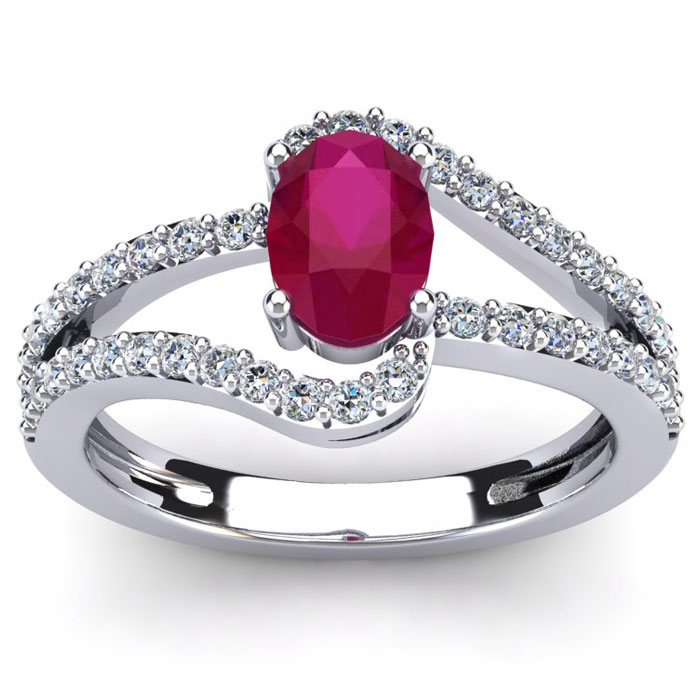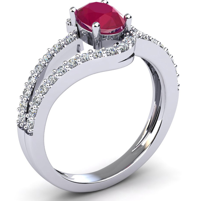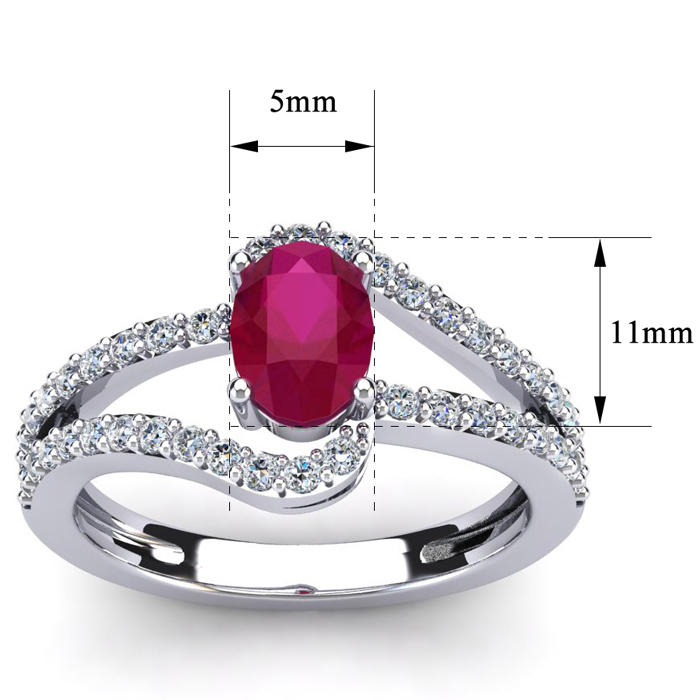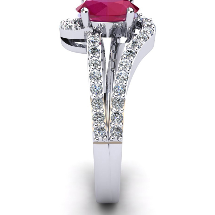 This ruby ring features one 7x5mm oval shape created ruby gemstone. It is surrounded by 42 sparkling diamonds totaling 0.40 carats in I-J color, I1-I2 clarity. Total carat weight is approximately 1.40 carats. This ring is in sterling silver.