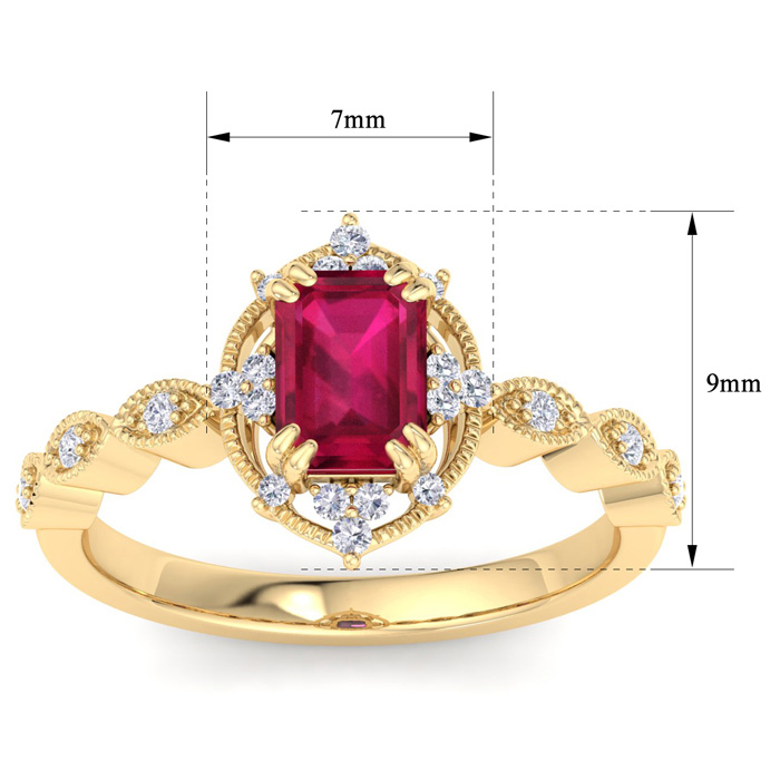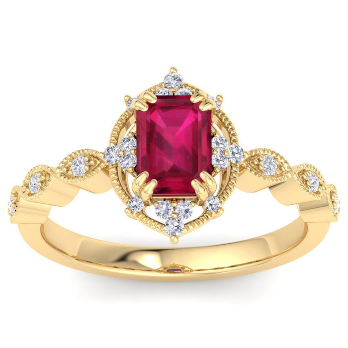 This gemstone ring features one 7x5mm octagon shape ruby gemstone weighing approximately 3/4 carat. There are 22 sparkling round diamonds in I-J color, I1-I2 clarity totaling approximately 1/4 carat. Total carat weight is 1 carat. This ring is in 14 karat yellow gold.