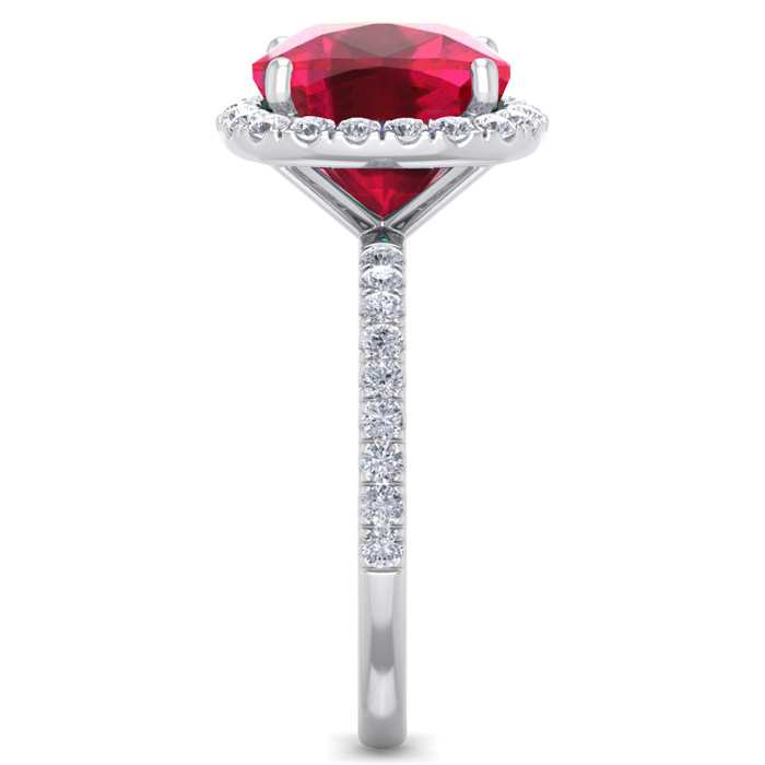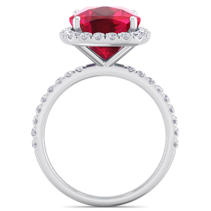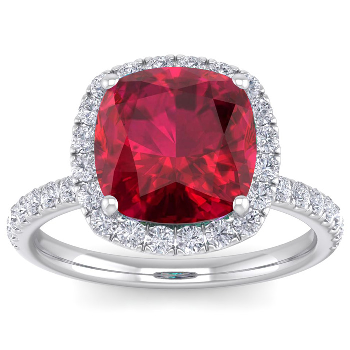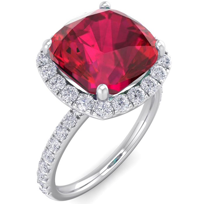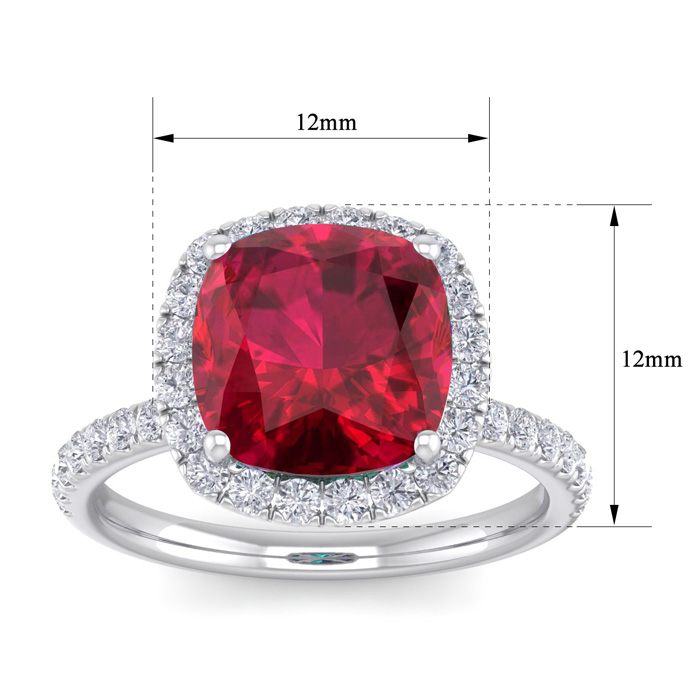 Retrograde Birthstones™ 5 1/2 Carat Cushion Cut Created Ruby and Halo Diamond Ring In Sterling Silver