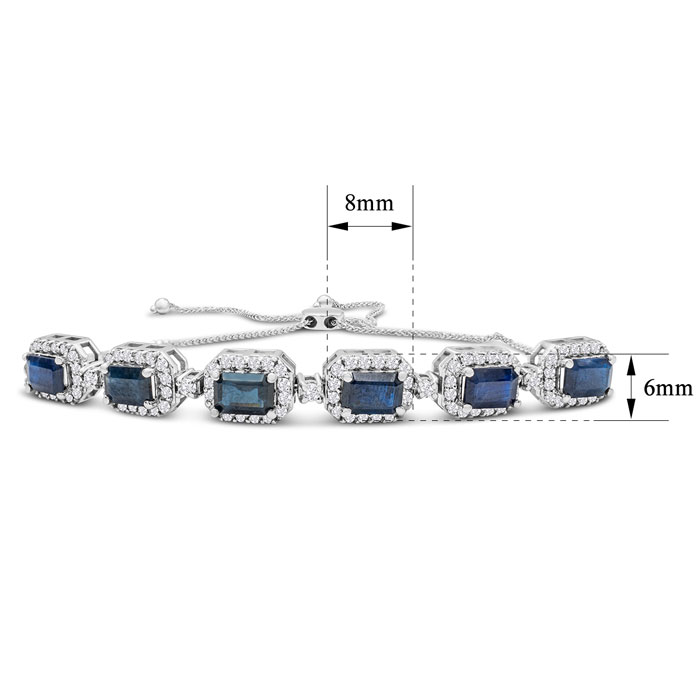 This stunning tennis bracelet features six 6x4mm emerald cut sapphire gemstones each weighing approximately 1/2 carat. It is surrounded by 89 sparkling diamonds in I-J color, I1-I2 clarity at 1 carat. Total carat weight is 4 carats. This bracelet is in 14 karat white gold and has an adjustable bolo clasp so you can wear it from 6-9 inches.