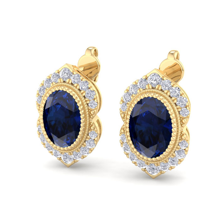 Retrograde Birthstones™ 2 1/2 Carat Oval Shape Sapphire and Diamond Earrings In 14K Yellow Gold