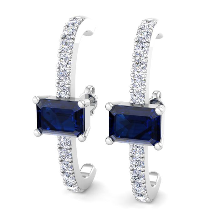 2 1/2 Carat Sapphire and Lab Grown Diamond Hoop Earrings In 14 Karat White Gold, 1 Inch - Emerald