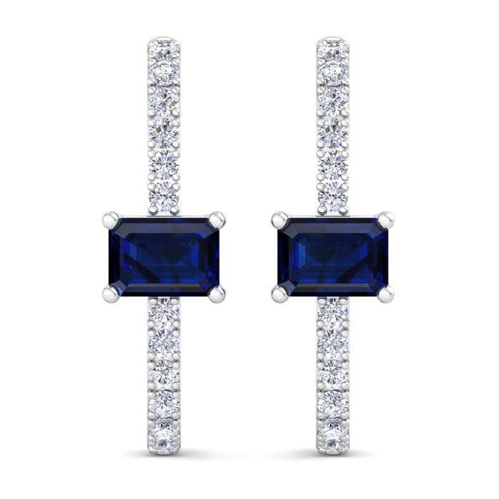 These sapphire earrings feature two 7x5mm emerald cut sapphire gemstones totaling approximately 2 carats. They are accented with 24 lab grown diamonds weighing 0.60 carats. Total carat weight is 2 1/2 carats. Diamond color is G-H color, VS clarity. These earrings are in 14 karat white gold and dangle down 1 inch.