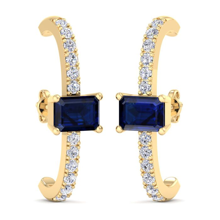 These sapphire earrings feature two 7x5mm emerald cut sapphire gemstones totaling approximately 2 carats. They are accented with 24 lab grown diamonds weighing 0.60 carats. Total carat weight is 2 1/2 carats. Diamond color is G-H color, VS clarity. These earrings are in 14 karat yellow gold and dangle down 1 inch.