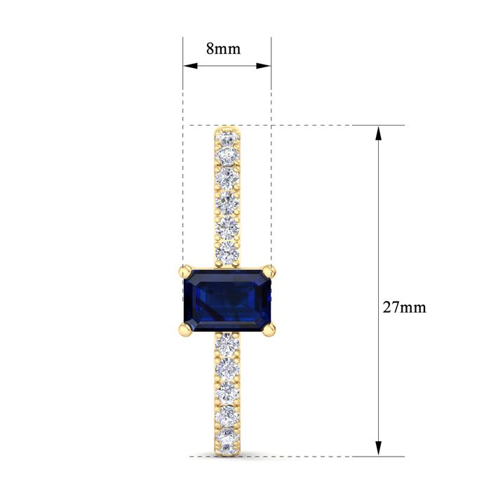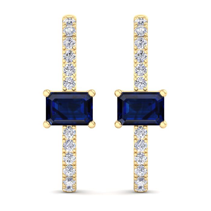 These sapphire earrings feature two 7x5mm emerald cut sapphire gemstones totaling approximately 2 carats. They are accented with 24 lab grown diamonds weighing 0.60 carats. Total carat weight is 2 1/2 carats. Diamond color is G-H color, VS clarity. These earrings are in 14 karat yellow gold and dangle down 1 inch.