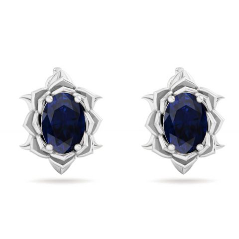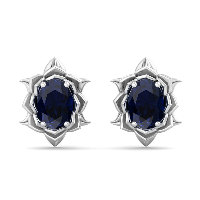 2 Carat Oval Shape Sapphire Ornate Stud Earrings In 14K White Gold