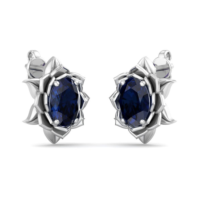 Retrograde Birthstones™ 2 Carat Oval Shape Sapphire Ornate Stud Earrings In 14K White Gold