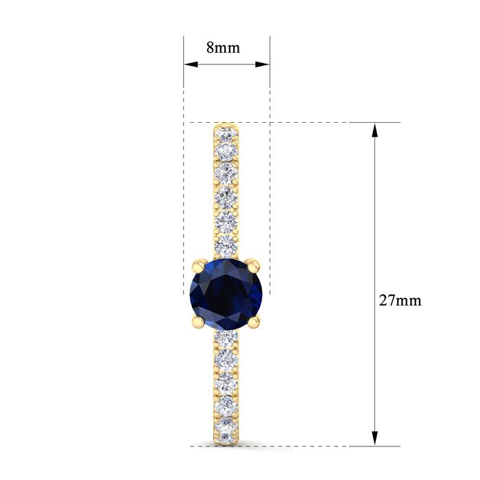 These sapphire earrings feature two 6mm round shape sapphire gemstones totaling approximately 1 1/2 carats. They are accented with 24 lab grown diamonds weighing 0.60 carats. Total carat weight is 2 carats. Diamond color is G-H color, VS clarity. These earrings are in 14 karat yellow gold and dangle down 1 inch.
