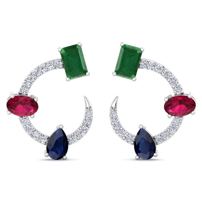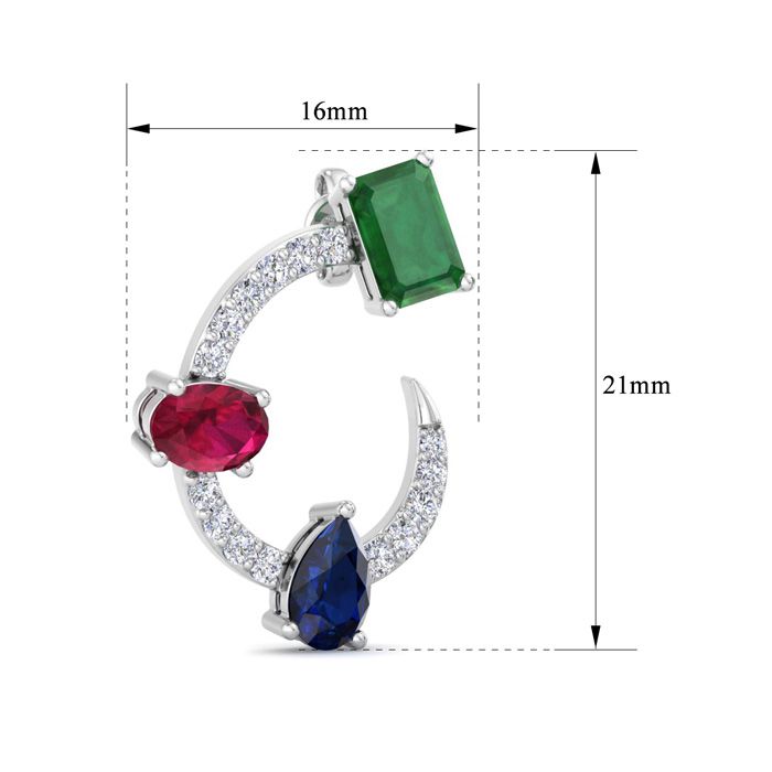 These lab grown diamond earrings feature 2 emerald cut emerald gemstones, 2 oval shape ruby gemstones, 2 pear shape sapphire gemstones and 30 round shape lab grown diamonds in G-H color, VS clarity. Total carat weight is 3 carats. These earrings are in 14 karat white gold. These earrings dangle down 3/4 Inch and have post with friction backs.
