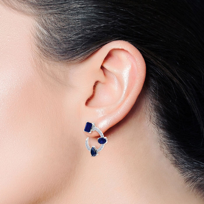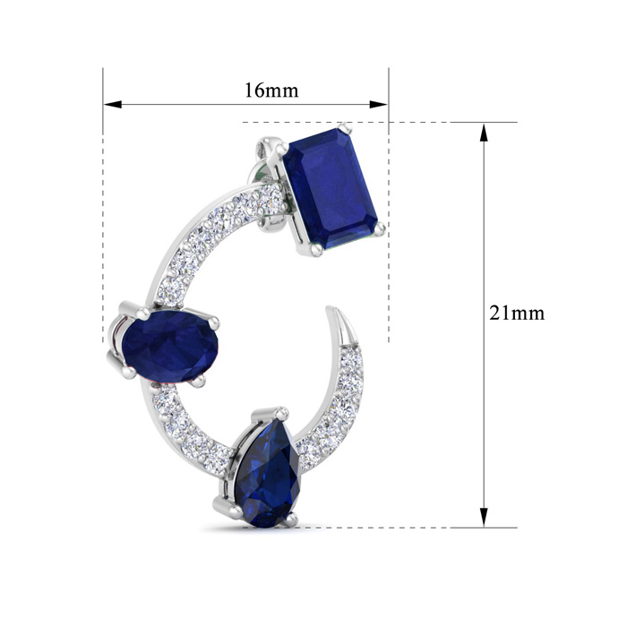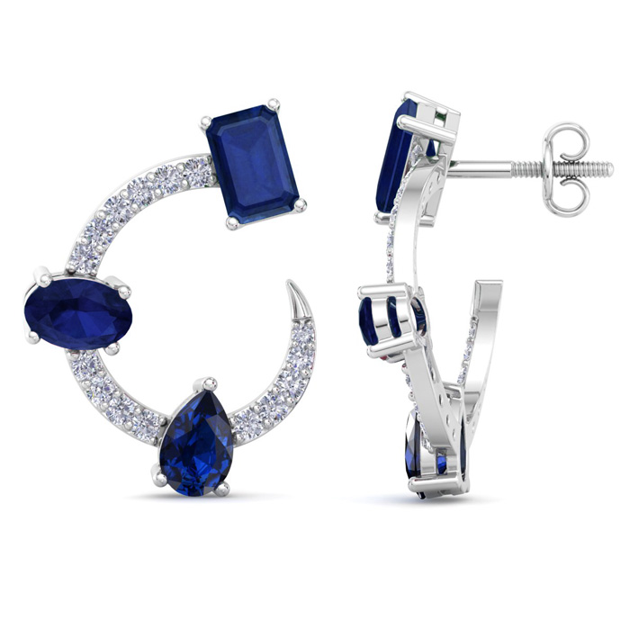 These lab grown diamond earrings feature 6 sapphire gemstones and 30 round shape lab grown diamonds in G-H color, VS clarity. Total carat weight is 3 carats. These earrings are in 14 karat white gold. These earrings dangle down 3/4 Inch and have post with friction backs.