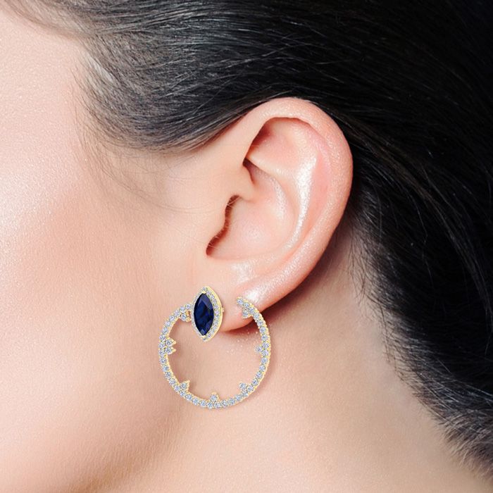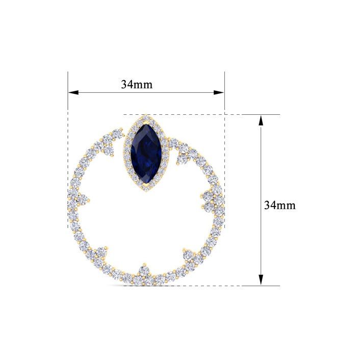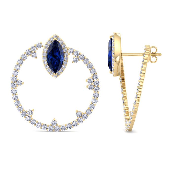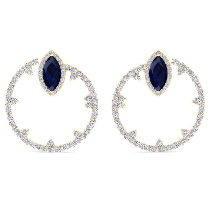 These sapphire earrings feature 2-12x6mm marquise shape sapphire gemstones totaling approximately 3 carats. They are accented with 136 lab grown diamonds weighing 3 carats. Total carat weight is 6 carats. Diamond color is G-H color, VS clarity. These earrings are in 14 karat yellow gold and dangle down 1 1/3 inches.