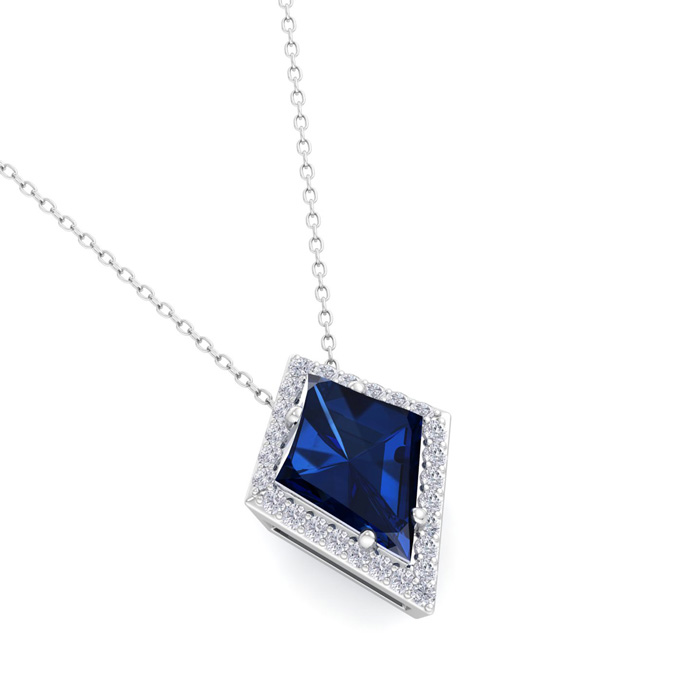 This gemstone necklace features one 10x7mm kite shape created sapphire gemstone weighing approximately 1 1/2 carats. There are 26 sparkling diamonds in I-J color, I1-I2 clarity totaling approximately 1/4 carat. Total carat weight is 1 3/4 carats. This necklace is in 14 karat white gold and comes with an 26 inch box chain with spring ring clasp.