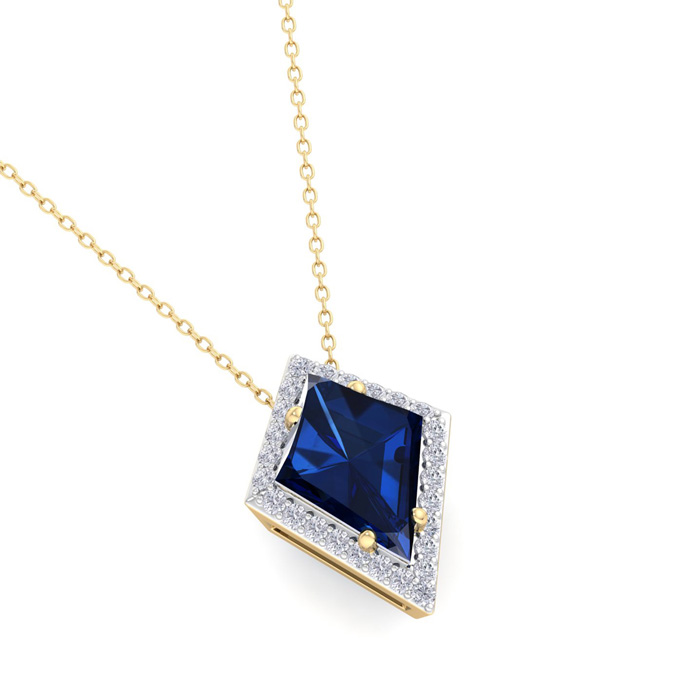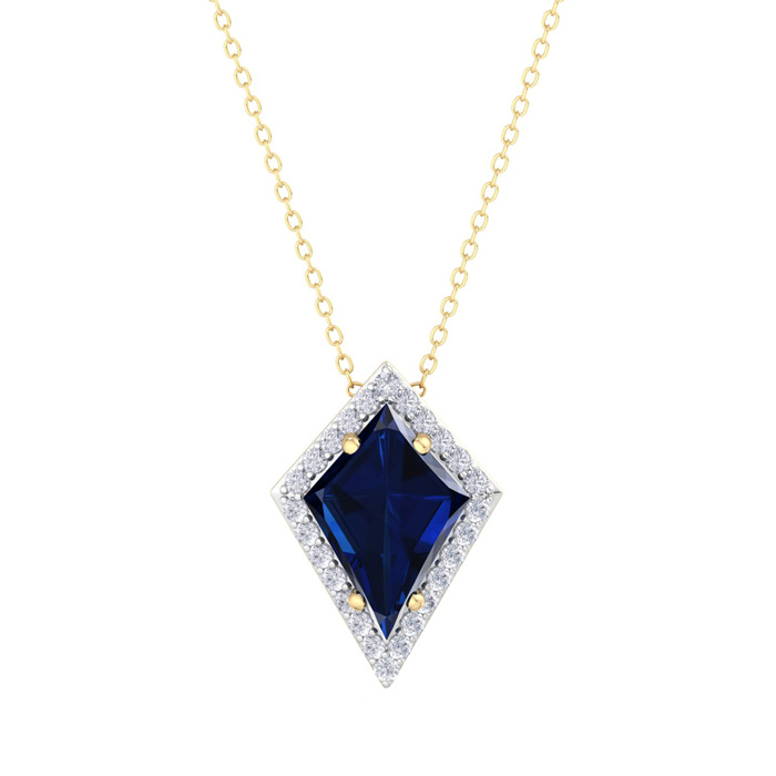 This gemstone necklace features one 10x7mm kite shape created sapphire gemstone weighing approximately 1 1/2 carats. There are 26 sparkling diamonds in I-J color, I1-I2 clarity totaling approximately 1/4 carat. Total carat weight is 1 3/4 carats. This necklace is in 14 karat yellow gold and comes with an 26 inch box chain with spring ring clasp.