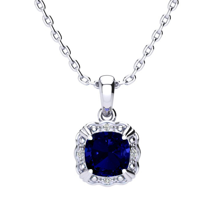 This stunning sapphire necklace features one 8x8mm cushion shape created sapphire gemstone weighing approximately 2 carats. It is surrounded by 4 sparkling diamonds in I-J color, I1-I2 clarity at 0.04 carats. This necklace is crafted in sterling silver and comes with an 18 inch cable chain with spring ring clasp.