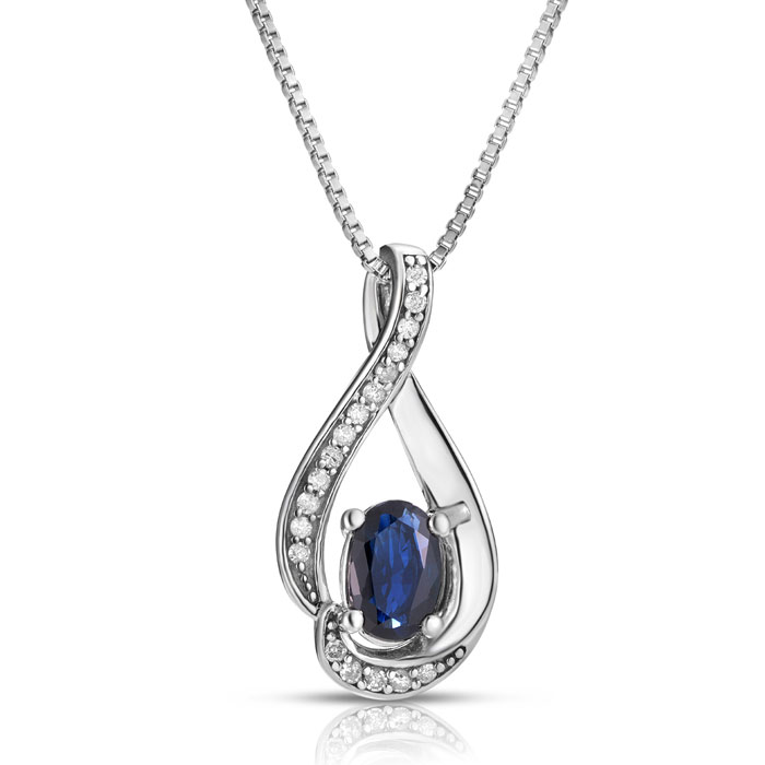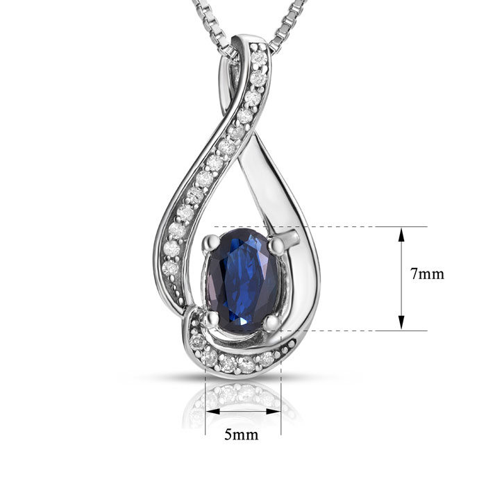 This stunning sapphire necklace features one 6x4mm oval shape Sapphire gemstone weighing approximately 3/4 carat. It is surrounded by 18 sparkling diamonds in H-I color, I2-I3 clarity at 0.08 carats. This necklace is crafted in sterling silver and comes with an 18 inch box chain with spring ring clasp.