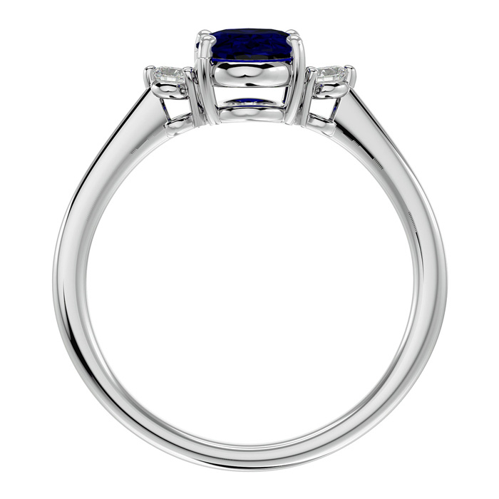 This sapphire ring features one 8x6mm oval shape created sapphire gemstone. It is surrounded by two sparkling diamonds totaling 1/10 carat in I-J color, I1-I2 clarity. Total carat weight is approximately 1 1/3 carats. This ring is in sterling silver.