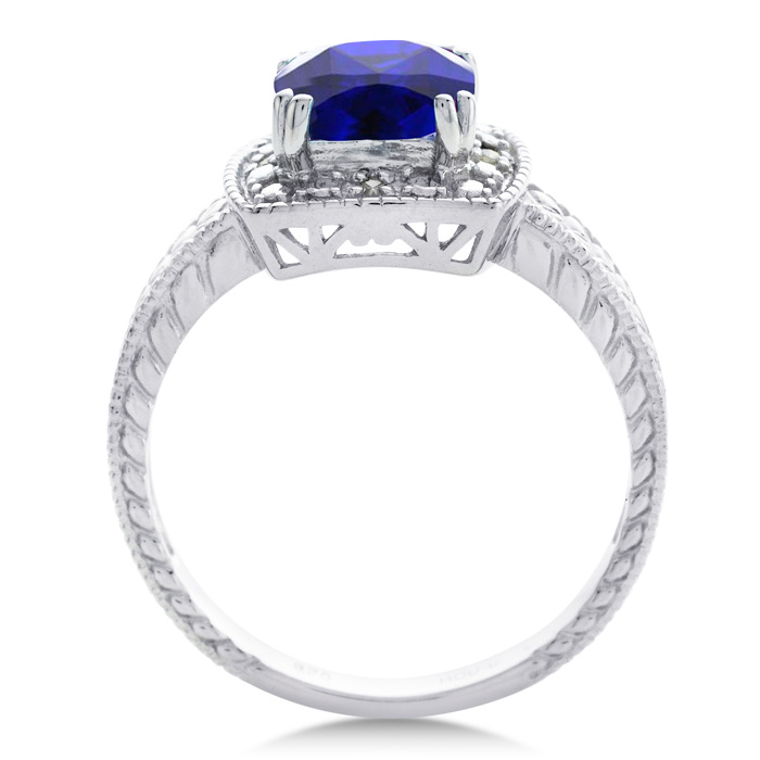 This sapphire ring features one 7x7mm cushion shape created sapphire gemstone. It is surrounded by 4 sparkling diamonds totaling 0.02 carats in I-J color, I1-I2 clarity. Total carat weight is approximately 1 1/4 carats. This ring is in sterling silver.